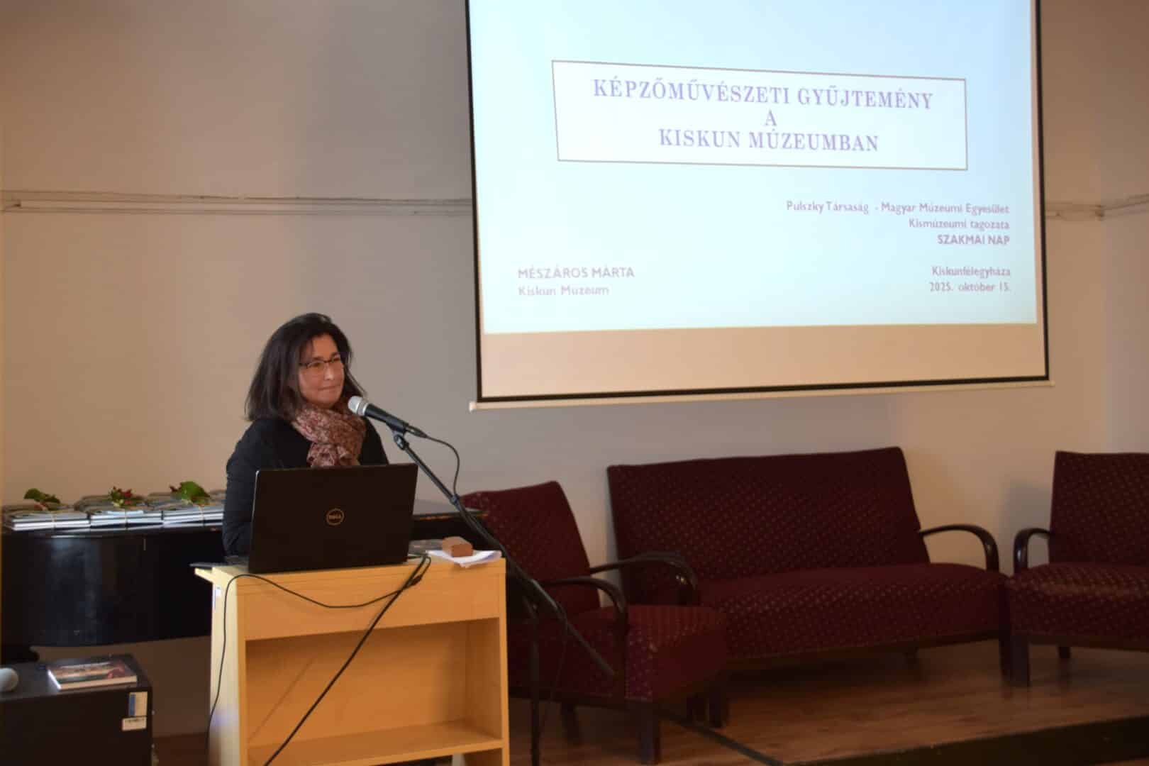 Mészáros Márta a Képzőművészeti gyűjtemény a Kiskun Múzeumban című előadásában tényekről és számokról tájékoztatta a megjelenteket. Elmondta, hogy a kiskunfélegyházi múzeum legfiatalabb és legkisebb gyűjteménye a képzőművészeti alkotások tára, a kezdeteket 1959-re tehetjük. A múzeumot 1902-ben alapították az akkori gimnázium régiségtárára alapozva, amelyben nem szerepelt jelentős mennyiségű képzőművészeti alkotás. Az első beleltározott műtárgy Lotz Károly 1894-es akvarellje, mellette elsősorban történelmi személyeket ábrázoló festmények szerepeltek, amelyek a Kiskun Kerületi kapitányságnak a padlásán voltak fellelhetők. A képzőművészeti gyűjtemény kezdete dr. Mezősi Károly, a tanítóképző igazgatójának nevéhez fűződik, aki megkezdte a műtárgyak leltározását. A különgyűjtemény létrejöttét Holló László festőművész ajándéka indította el, amely akkor négy festményt jelentett. Ez a néhány festmény 1961-ben kollekcióvá gyarapodott és 1969-ben létrejöhetett az első állandó tárlat. A gyűjteményi elv ma is a helyi kötődés megléte, az országosan elismert művészek és a Holló László-díjas alkotók, valamint figyelmet érdemelnek a félegyházi amatőr művészek munkái is. A gyűjteménygyarapításban és állandó kiállítások szervezésében korszakalkotó munkát végzett Bánkiné dr. Molnár Erzsébet egykori múzeumigazgató, akinek közbenjárására Holló László mellett Szántó Piroska és Morell Mihály alkotások is helyet kaptak a múzeum falai között. Jelentős gyarapodást jelentett a múzeumnak fennállásának századik évfordulója, amely évben ajándékozásra kérték fel a művészeket. 2009-ben egy jelentős átalakulás eredményeképpen több félegyházi művész kiállítása valósulhatott meg, amit 2015-ben egy komplex MŰVÉSZ-TÉR kialakítása követett, a Petőfi Emlékházban. Utóbbi felújítása később nem tette lehetővé az állandó tárlatok megvalósítását és jelenleg a Kiskun Múzeum sem rendelkezik állandó képzőművészeti kiállítással. Álmuk egy művészcentrum megvalósítása, amely tárolást és tárlatigényt is kielégítene.