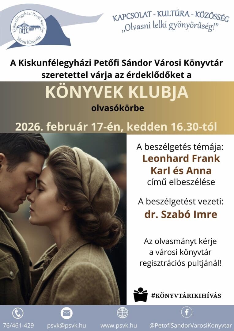 A Könyvek Klubja ezúttal is irodalmi élményt és tartalmas beszélgetést kínál az érdeklődőknek. A választott mű Leonhard Frank Karl és Anna című elbeszélése, amely a szerelem, a hűség és az identitás kérdéseit vizsgálja egy különleges élethelyzeten keresztül. A történet emberi sorsokat, belső vívódásokat és morális dilemmákat tár az olvasók elé, így bőséges alapot ad az értelmezésre és a közös gondolkodásra.
