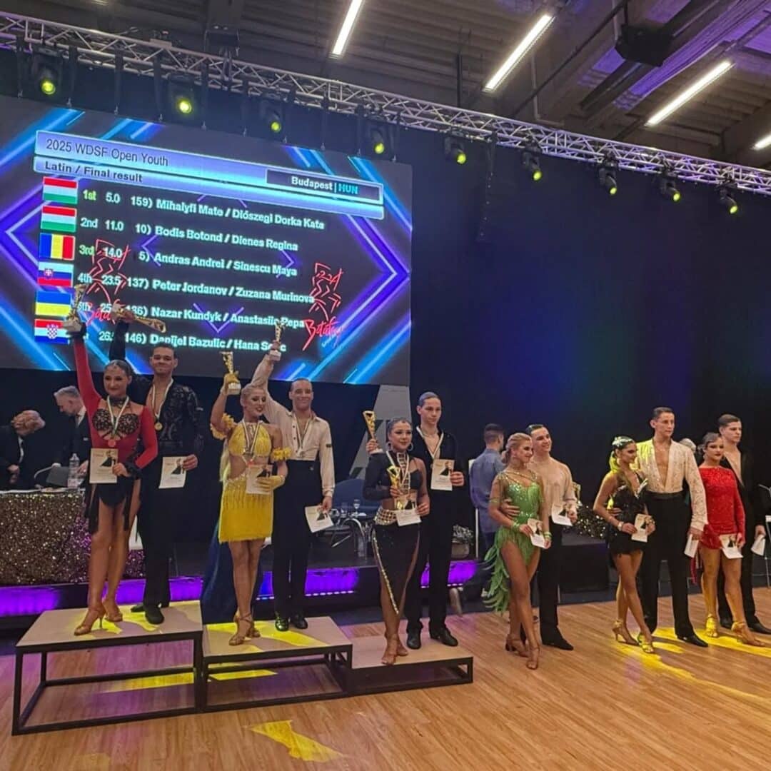 A másnapi megmérettetés azonban messze felülmúlta az előző nap eredményeit. Dorka és Máté elszántan menetelt a WDSF Youth Latin 33 fős mezőnyében az elődöntőben, később a középdöntőben és végül a döntőben is. Maximális teljesítményt nyújtva, maguk mögé utasították a versenytársakat, produkciójukkal bajnoki cím birtokosai lettek.
