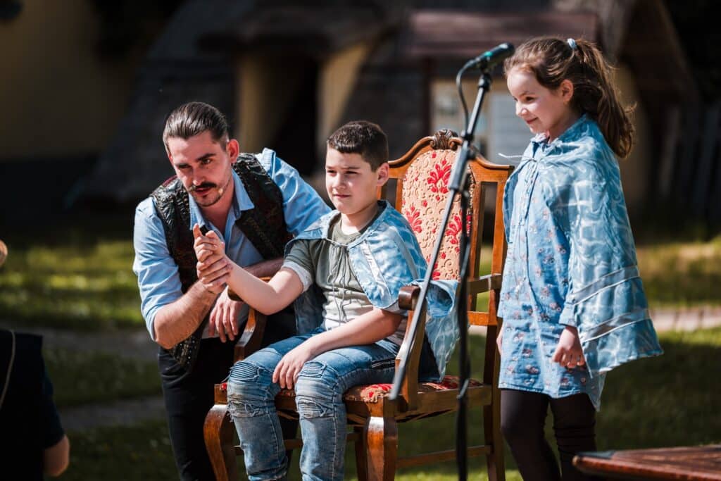 – A gyerekek valójában a főszereplők, mi Bendével csak a hangjuk és az aurájuk vagyunk. Ettől lesz igazán interaktív az előadás, hiszen a szereplőket mindig a nézőként érkező gyerekek közül választjuk ki. Általában csak a mese címét áruljuk el előre, így számukra is meglepetés, hogyan alakul a történet – tette hozzá Benedek.