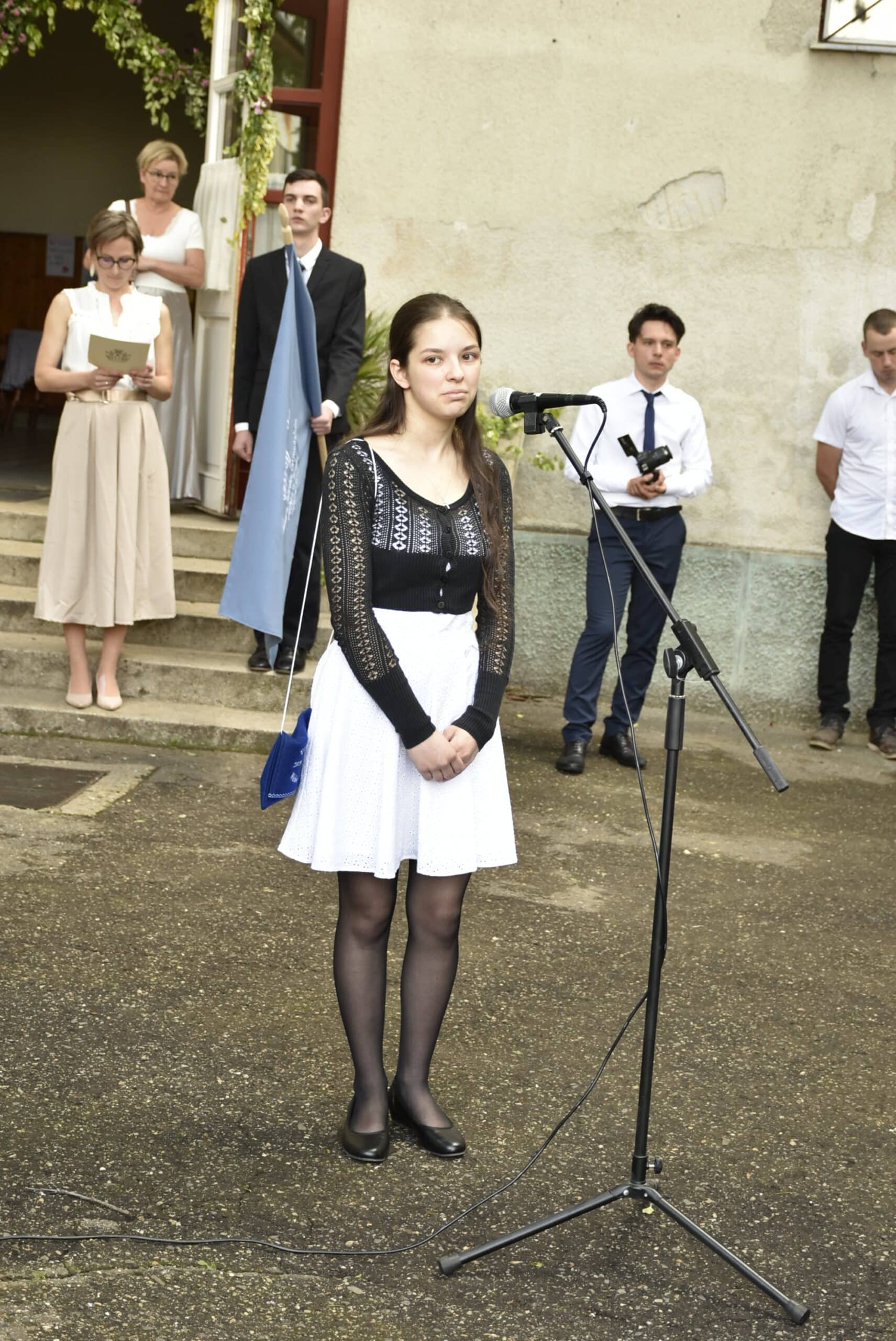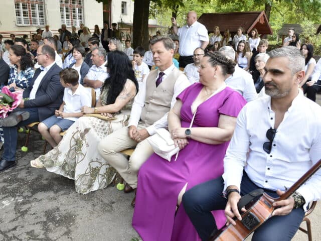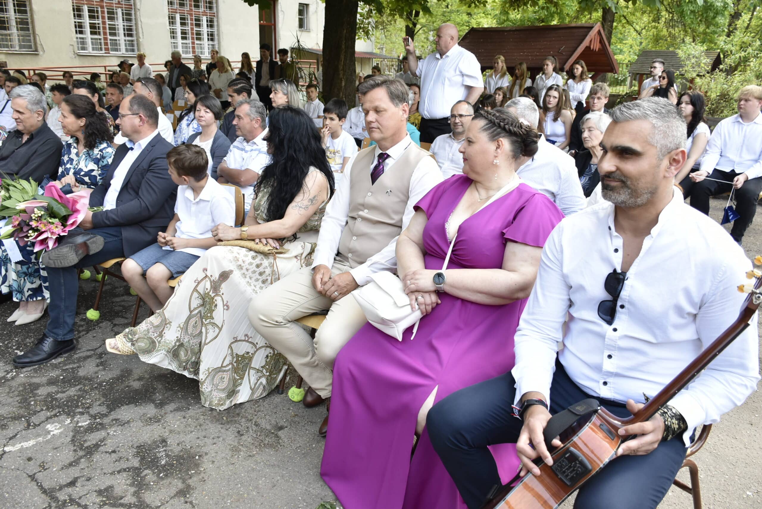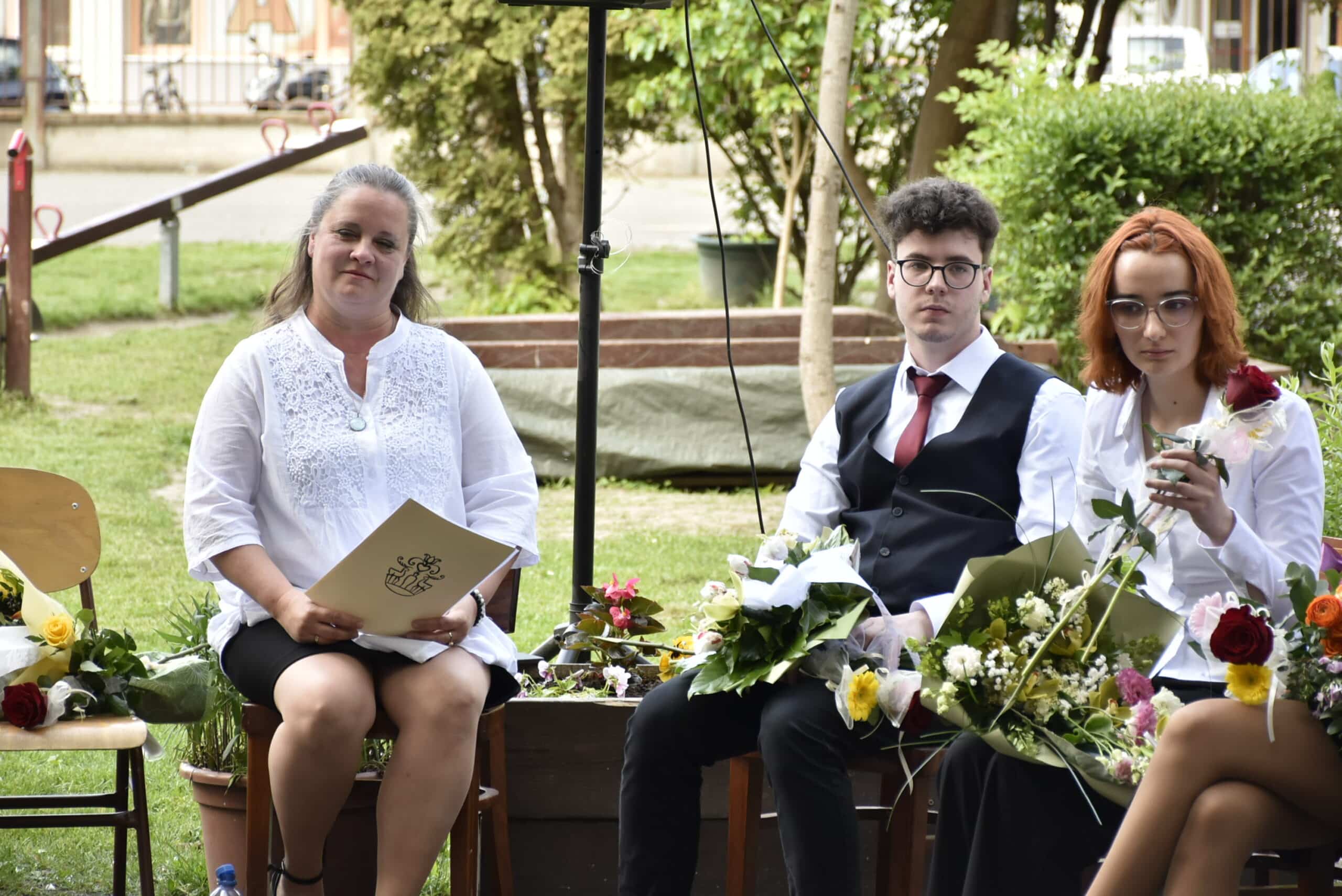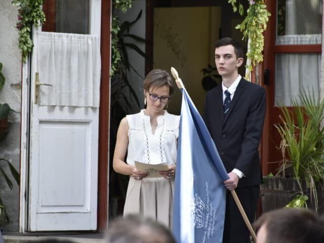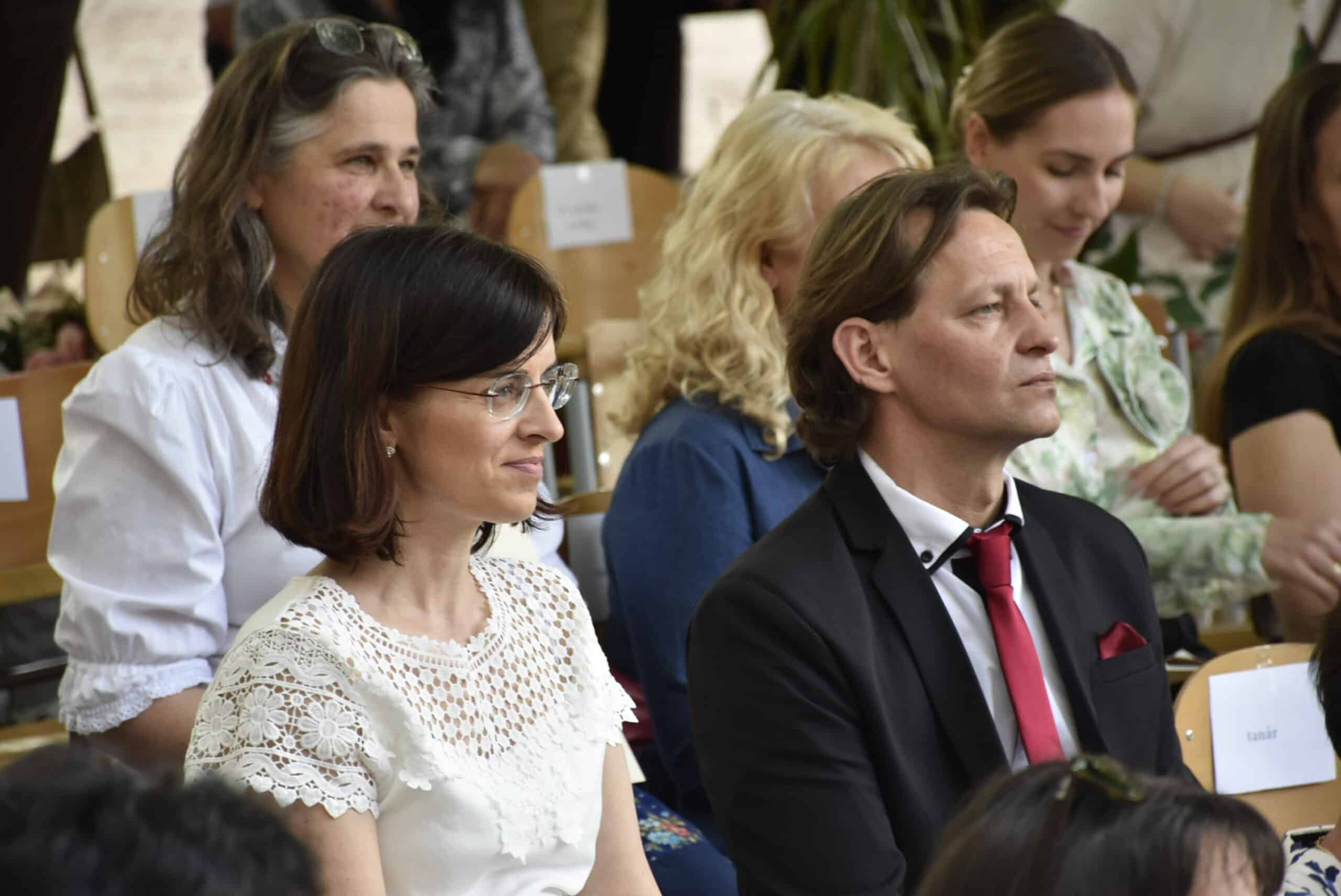 A két diák után Árvainé Volentér Éva, a végzősök osztálykísérője köszöntötte az ünneplő közösséget, álljon itt néhány gondolat az ő szeretetteljes szavaiból: – Ki hová ballag, ki hová siet, fut? Honnan jött, miért és hová megy? Kivel, kikkel, miért …..? Kifelé menni valahonnan, miközben valahová befelé haladni. Keresni, kutatni, érezni, látni, beszélni, akarni, szeretni…. közben. Olyan szép itt lenni veletek, kedves szülők, a rokonok csodálkozó tekintetében, szeretetteljes tanári kollégiumunk és dolgozóink jelenlétében egy ünnepi órában, amit arra szentelünk, hogy közösen gondoljunk vissza az elmúlt öt évre, figyelmünket felemeljük egy kicsit, megálljunk.