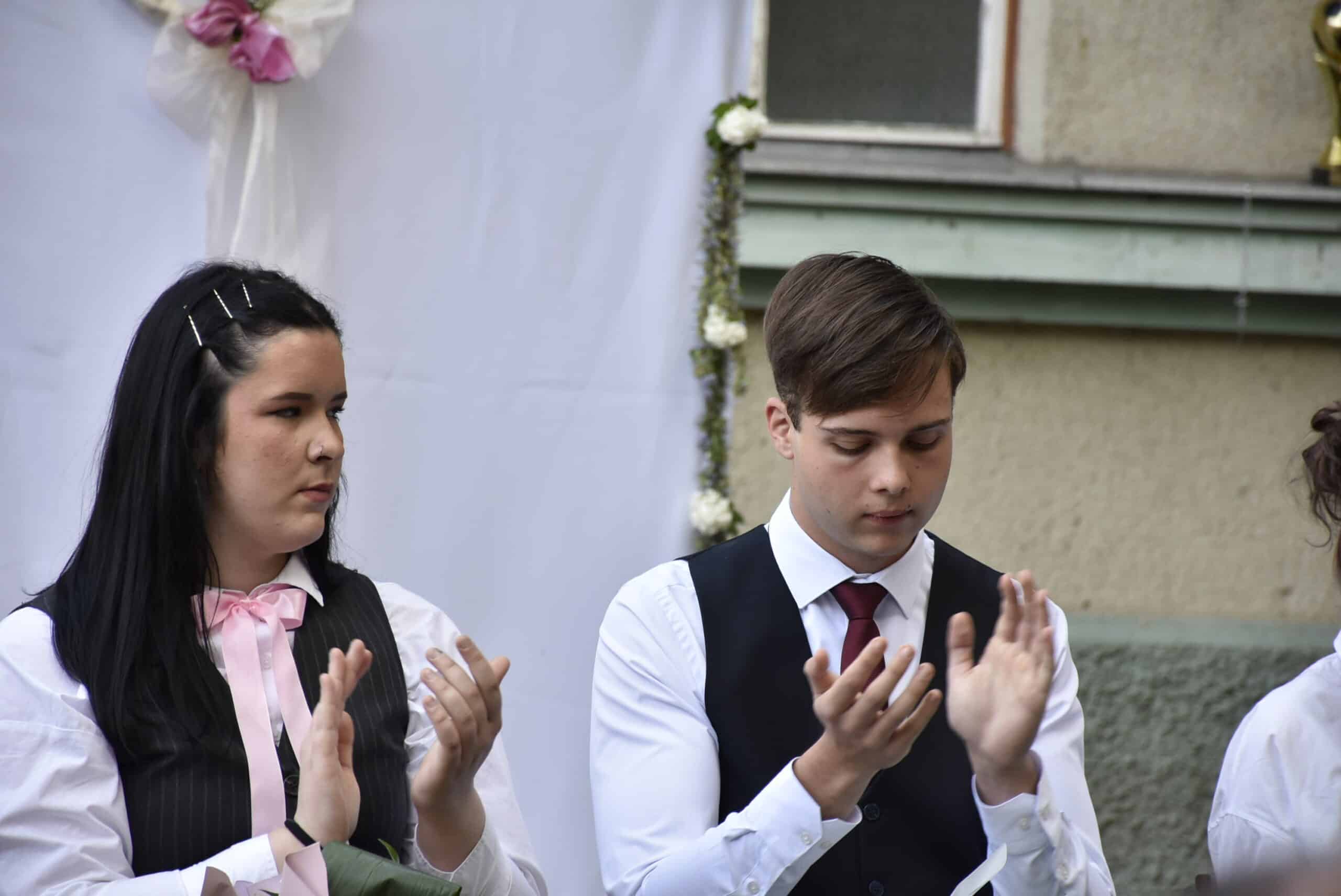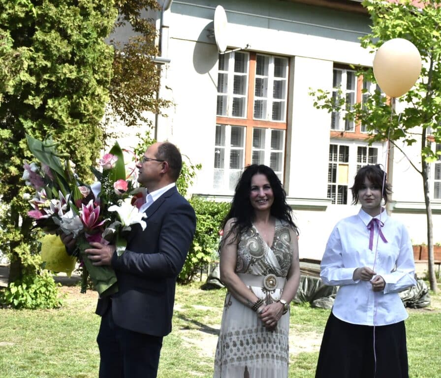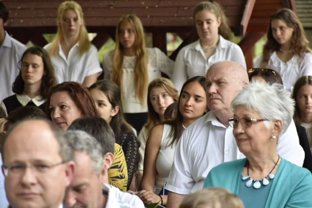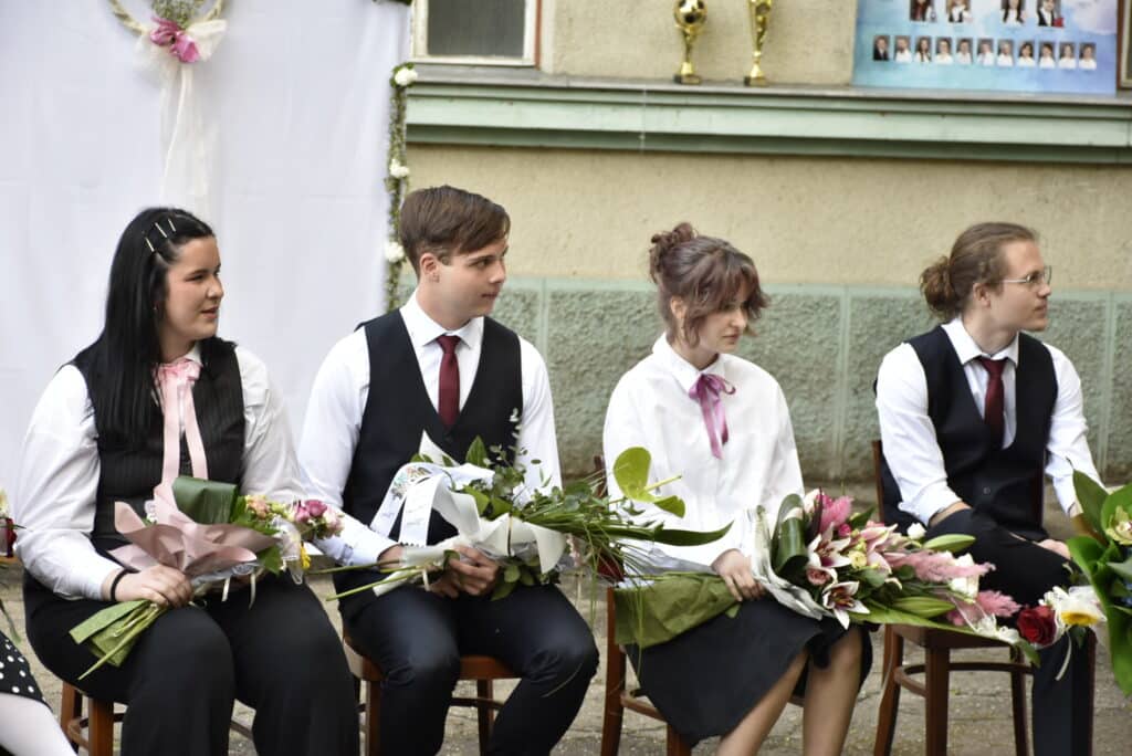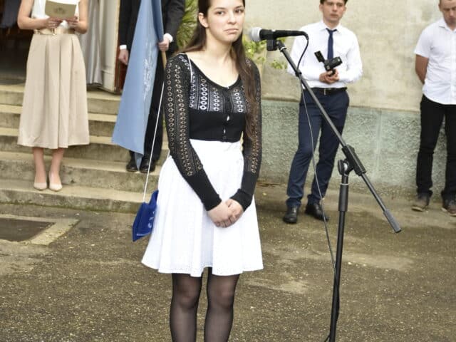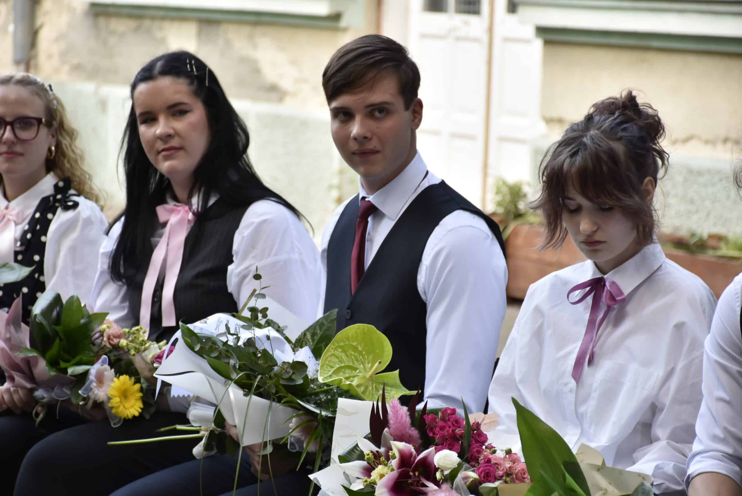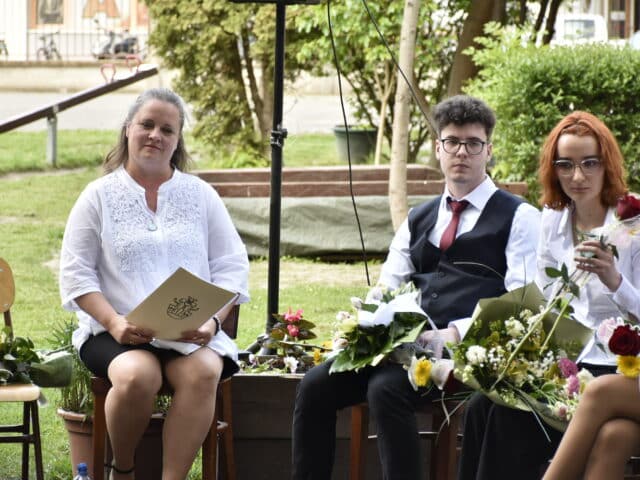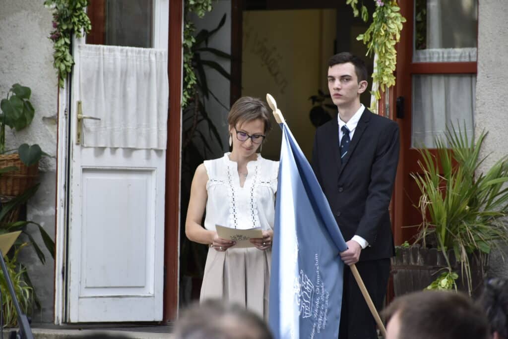 – Azért állok most itt a mikrofonnál ezen a szép ünnepi napon, hogy búcsúbeszédet mondjak a 13. osztály nevében. Nem egyszerű feladat, hiszen nem állnak halomban a ballagási búcsúbeszédek az iskolában, hiszen mi vagyunk az első osztály, aki elballag a gimnáziumból. Elsőnek lenni valamiben nehéz és izgalmas dolog is egyben, ezt megtapasztaltuk gimnáziumi éveink alatt. Az életet gyakran hasonlítják az utazáshoz, ezt az utazást egy vonatúthoz hasonlítva tudnám legjobban átadni: minden reggel a hajnalban kelés várta a nagy többséget, a MÁV lestrapált mozdonyai vánszorogtak velünk az iskola felé. Beérve az első órára, gondolatban még nem szálltunk le erről a vonatról, tovább zötyögött velünk, óráról órára. Néha, mintha erőt vett volna magán és nagy lendülettel megindult, ekkor az események követhetetlen forgószélben váltották egymást hangos nevetések és nagy viták formájában.