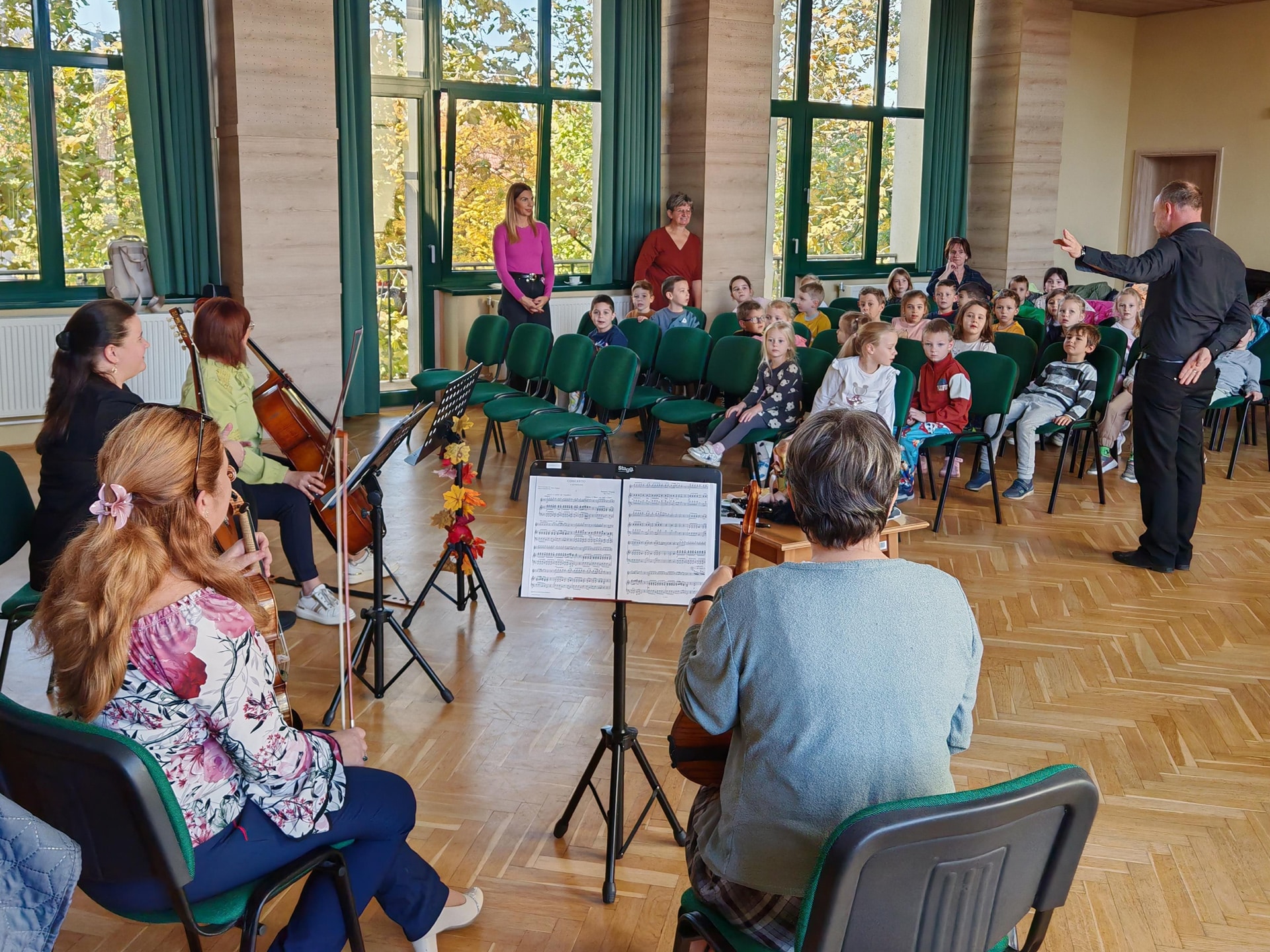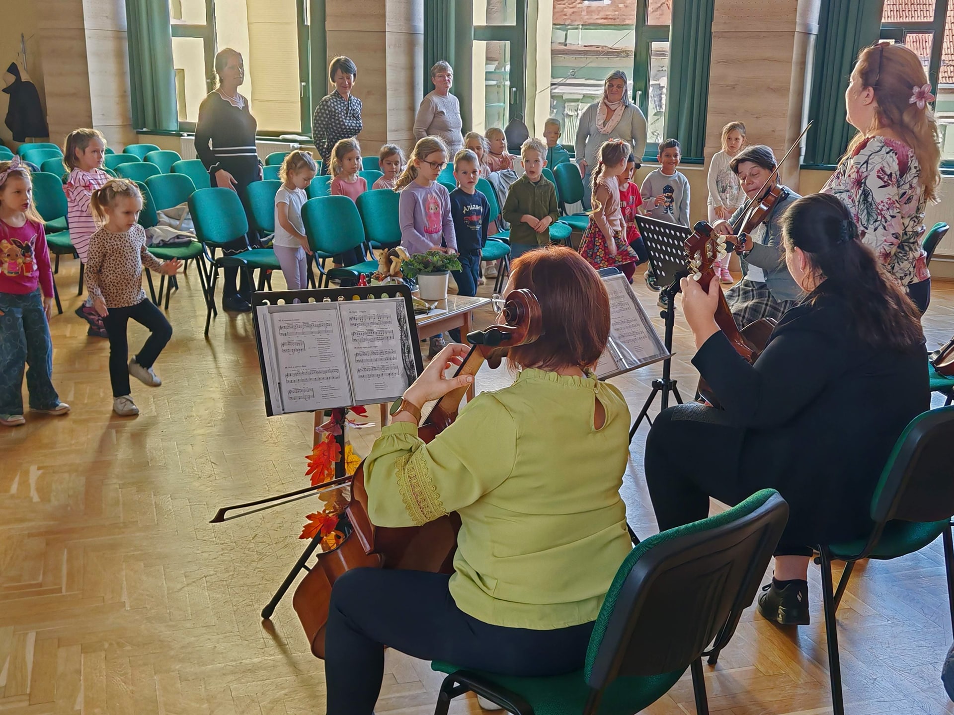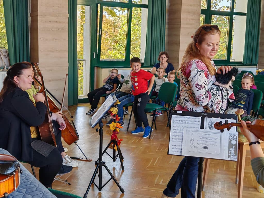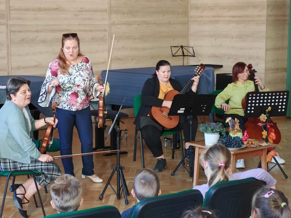 Évekkel ezelőtt érkezett a megkeresés a kicsik életkori sajátosságaira szabott komplex koncertek látogatására. A művészeti iskola tanárai örömmel mondtak igent az óvónéniknek, akik számára nagyon fontos, hogy a zenei nevelés áldásos hatásaival megajándékozzák a rájuk bízott gyerekeket. Az idei első foglalkozás – ahogyan a cím is sugalmazza – az őszről szólt október 16-án. A vonós tanszak tanárai, Kurai-Kis Szilvia, SzerinéBiró Ágnes, Závogyánné Varga Ildikó és Szarvas Alexandra gitártanár változatos repertoárral varázsolta el a gyerekeket. Többek között felcsendült Vivaldi Négy évszakjának Ősz tétele, de Gryllus Vilmos dallamai is elhangzottak. Amíg a népes társaság egyik része a koncerten hallgatta a zenét, illetve énekelt, addig a többiek együtt táncoltak Kósa István társastánc tanárral. Az ovisok a további alkalmakon találkozhatnak a fafúvós hangszerek családjával, például a klarinéttal, fuvolával, vagy oboával. Megismerkedhetnek az olyan rézfúvós hangszerekkel, mint a harsona, vagy a kürt. Bepillantást kapnak az ütős hangszerek sokszínűségébe, illetve az örök kedvenc, a zongora is megszólal egy alkalommal. A néptánccal, népi játékokkal Fekete Beatrix segítségével találkoznak látogatásaik során az óvodások. A „nagyok” visszatérve az óvodába, napokig mesélnek élményeikről a „kicsiknek”, akik alig várják, hogy ők is mehessenek a zeneiskolába táncolni, koncertezni.