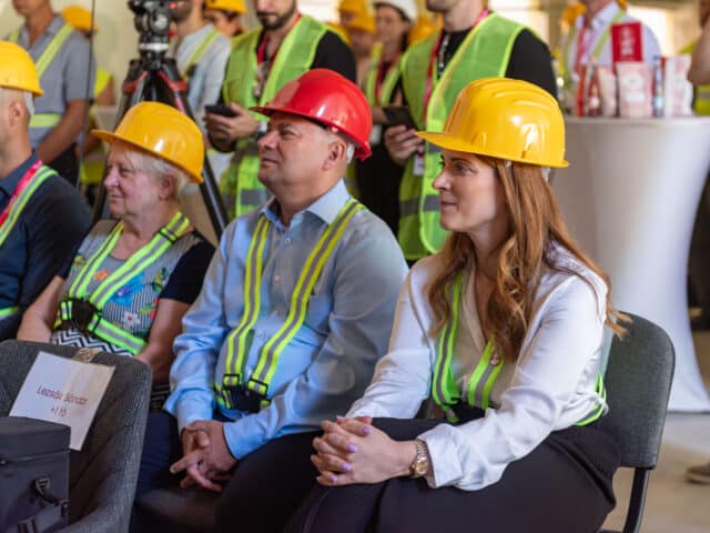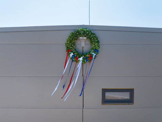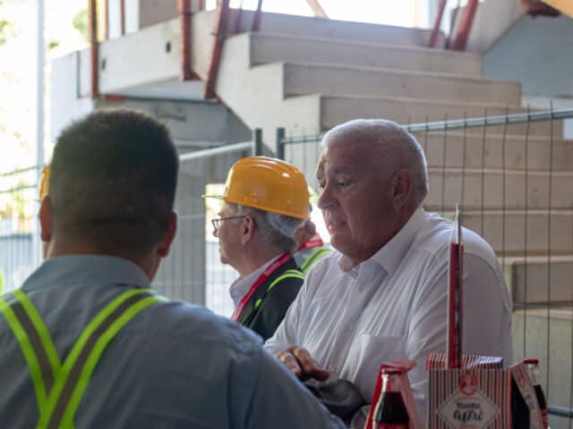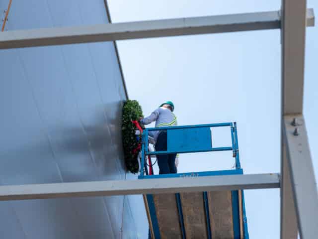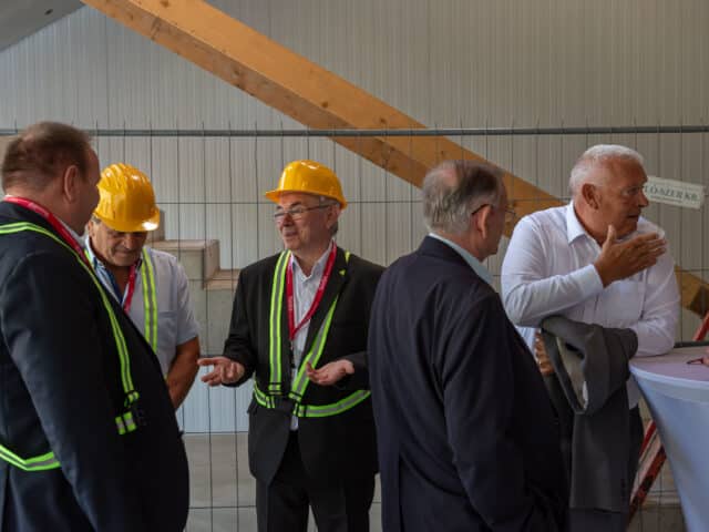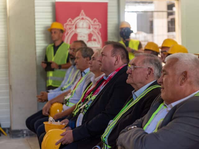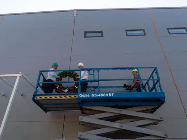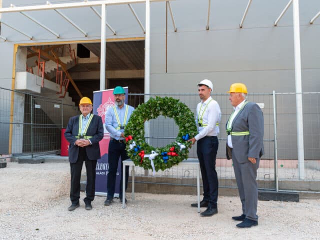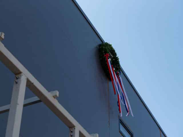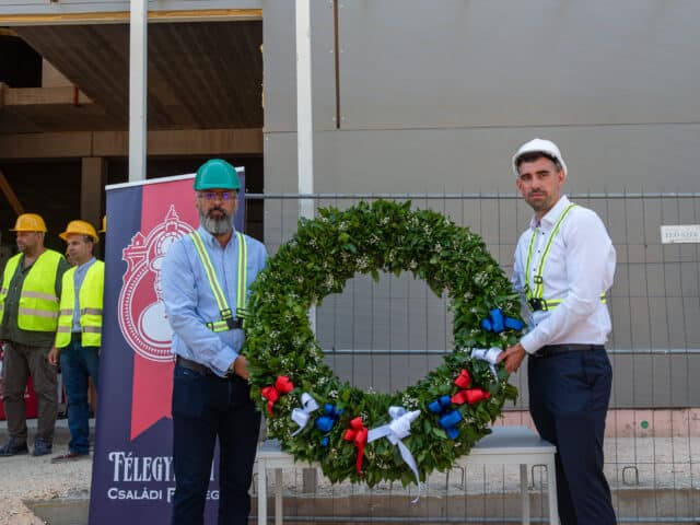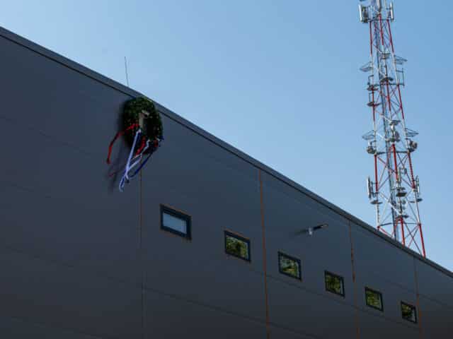 A bokrétaünnep zárásaként Gulyás Gergő a kivitelező Előszer Kft. ügyvezetője, Máriás Ferenc társaságában egy emelő segítségével elhelyezték a bokrétaünnep hagyományát megidéző koszorút a félkész épület homlokzatán.