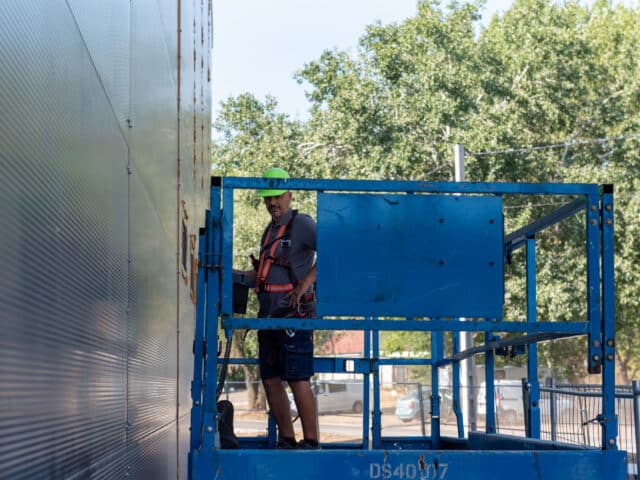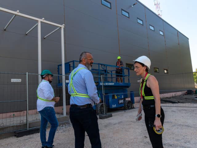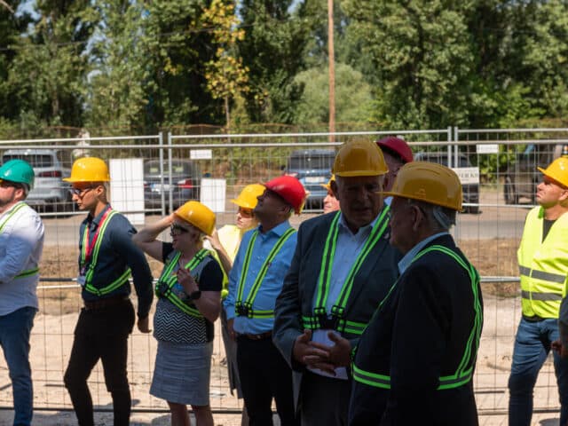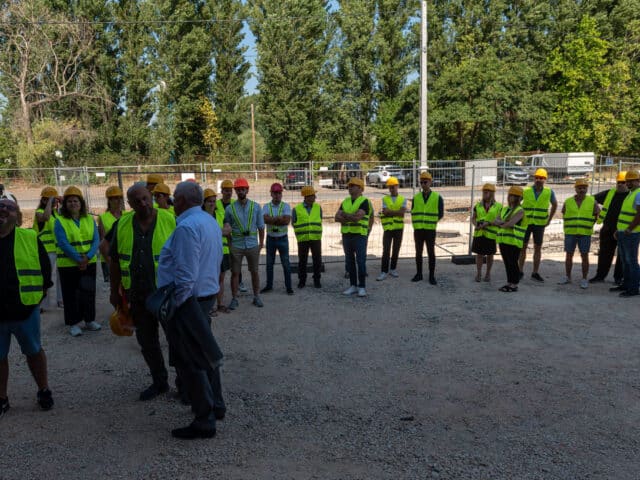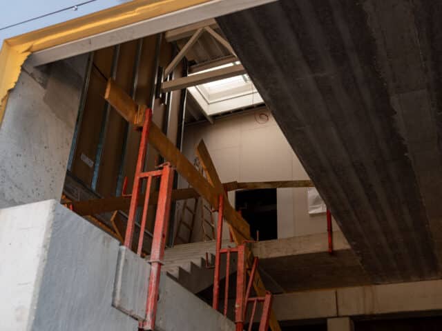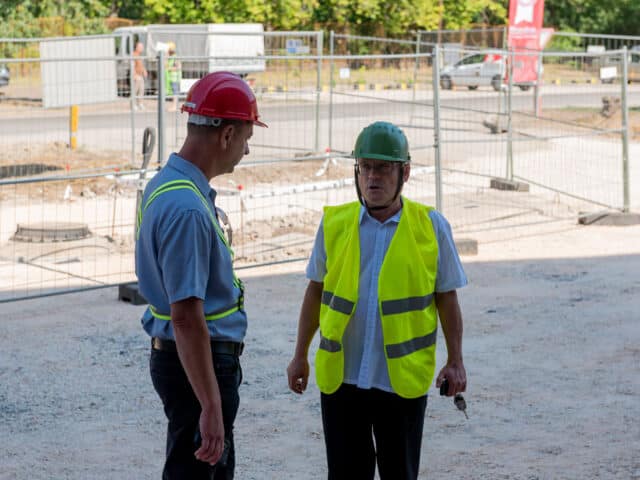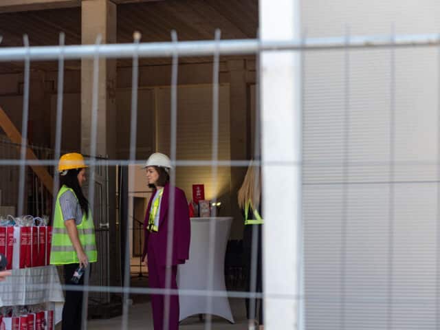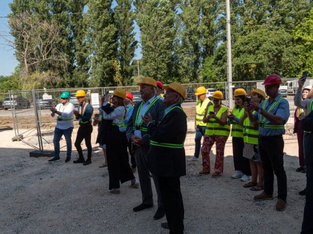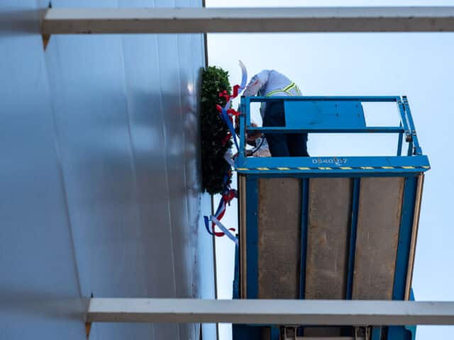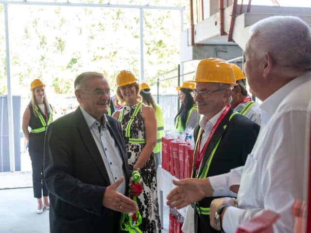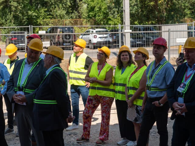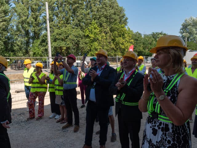 A bokrétaünnep zárásaként Gulyás Gergő a kivitelező Előszer Kft. ügyvezetője, Máriás Ferenc társaságában egy emelő segítségével elhelyezték a bokrétaünnep hagyományát megidéző koszorút a félkész épület homlokzatán.