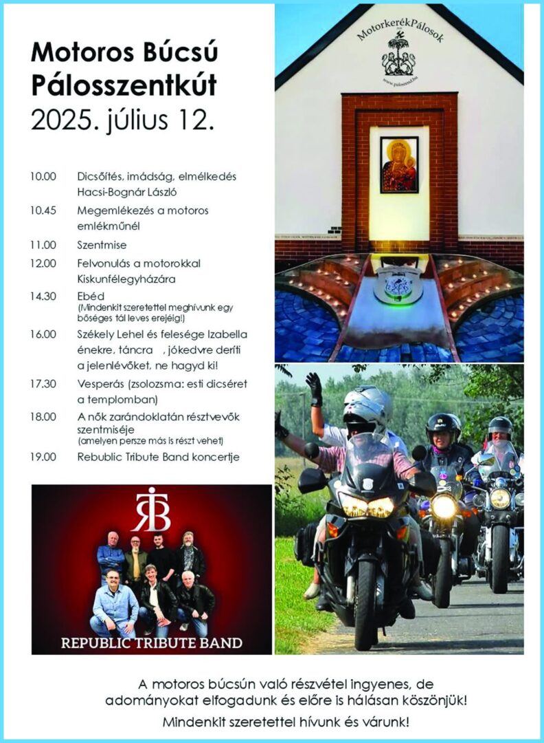A nap 10 órakor dicsőítéssel és elmélkedéssel indul Hacsi-Bognár László vezetésével, majd 10.45-kor megemlékezést tartanak a motoros emlékműnél. 11 órakor ünnepi szentmise következik, amit motoros felvonulás követ 12 órától Kiskunfélegyházára.