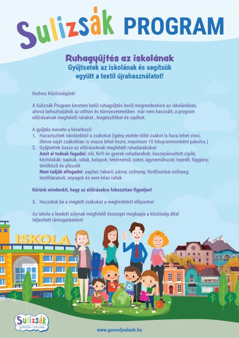 – Az akció keretében a diákok és családjaik otthon már nem használt, de jó állapotú ruhákat, cipőket és kiegészítőket hozhatnak be az iskolába, amelyeket a program előírásainak megfelelően gyűjtünk össze. A Sulizsákos zsákok hazavihetők és megtöltve, maximum 10 kilogrammos egységekben visszahozhatók az intézménybe – részletezte Magyari-Benkő Gabriella igazgatóhelyettes.