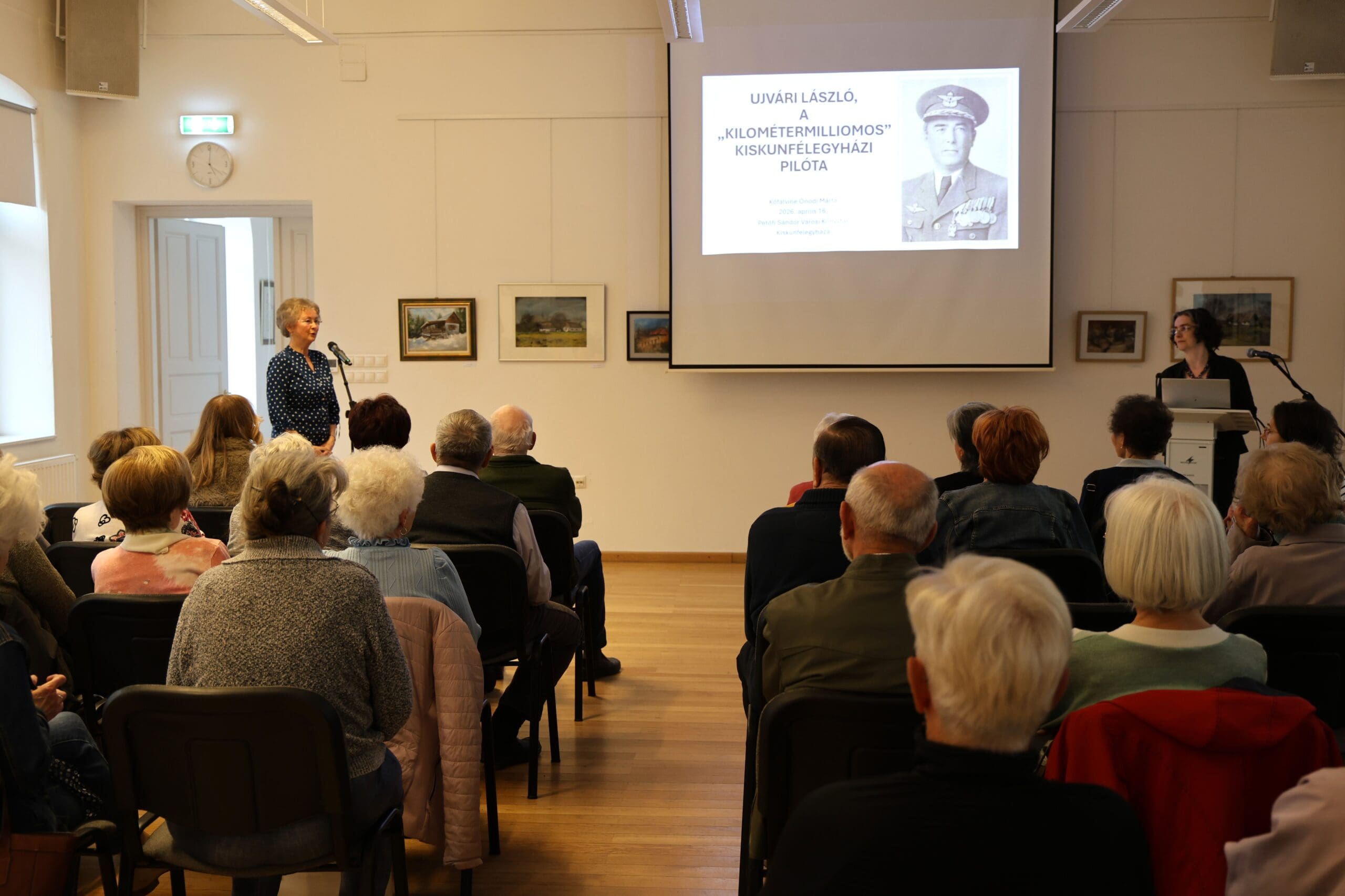 Dr. Kőfalviné dr. Ónodi Márta előadását Ujvári László felmenőivel kezdte, majd a neves kiskunfélegyházi iskoláit mutatta be, Megtudtuk, hogy az elemit a Kossuth utcai iskolában, középiskolai éveit a főgimnáziumban töltötte. Fiatalként jó tanulmányi eredményei miatt több városi támogatásban és jutalmakban részesült. A közösséget szívügyének tekintette: az ifjúsági önképzőkör elnöke és a városi füleslabda csapat tagja is volt. Gépészmérnöki képesítését a Műegyetemen szerezte, majd a háború ideje alatt tiszti vizsgát tett. Nagyjából ez időre tehető pilóta karrierjének kezdete. A háború ideje alatt pilótaként szerzett érdemeket, feljegyzései szerint összesen 229 órát repült, amelyből 8 alkalommal légigyőzelmet is aratott. Ezeket az években több állami kitüntetésben is részesült. A háború után Magyar Aero Szövetségbe jelentkezett, majd a békediktátum után a légierő fedőszervénél, a Magyar Aeroforgalmi Rt-nél helyezkedett el. Ebben az időben kötött házasságot Kürtösi Margittal, amely frigyből két fiuk született. Később közforgalmi pilótaként tevékenykedett, majd nemzetközi utak jellemezték karrierjét. A kor szokatlan feladatokat is adott az akkori pilótáknak, amelyből Ujvári László is részesült: előfordult, hogy újságot is hordott ki repülőgépével, vagy rakományát több ezer fecske alkotta, hiszen mentőprogram keretein belül szállította az állatokat országokon át. Repülőútjai során bár előfordultak balesetek, szerencsére neki soha nem esett bántódása.