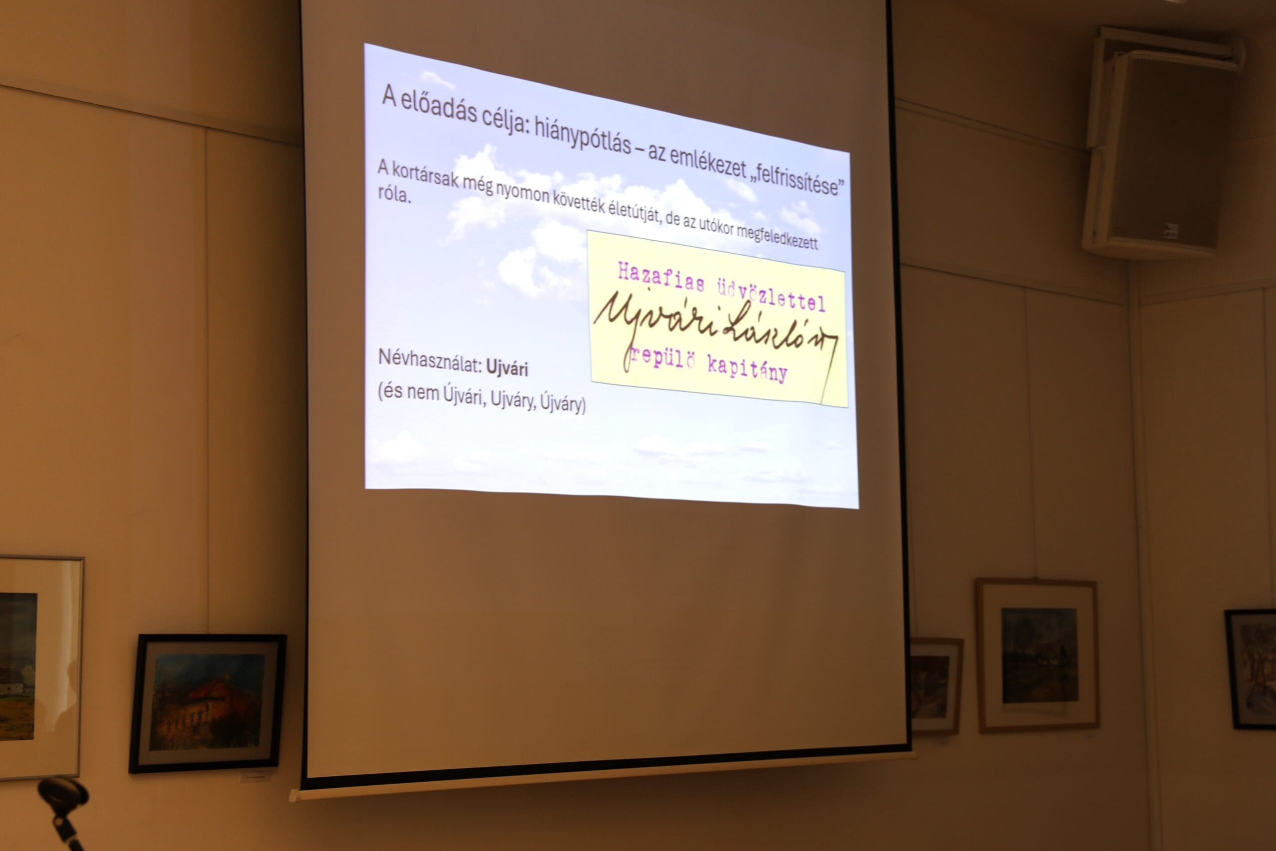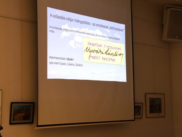 Az előadó prezentációja kezdetén hangsúlyozta, hogy Ujvári Lászlóról sajnos egyetlen kiskunfélegyházi helyismereti szakirodalomban sincs említés és ezt a hiányt igyekezett pótolni kutatásával. Mivel életében a félegyháziak számon tartották tevékenységét, ezért tartja fontosnak a ma élők emlékezetében is felfrissíteni a félegyházi pilóta életútját.