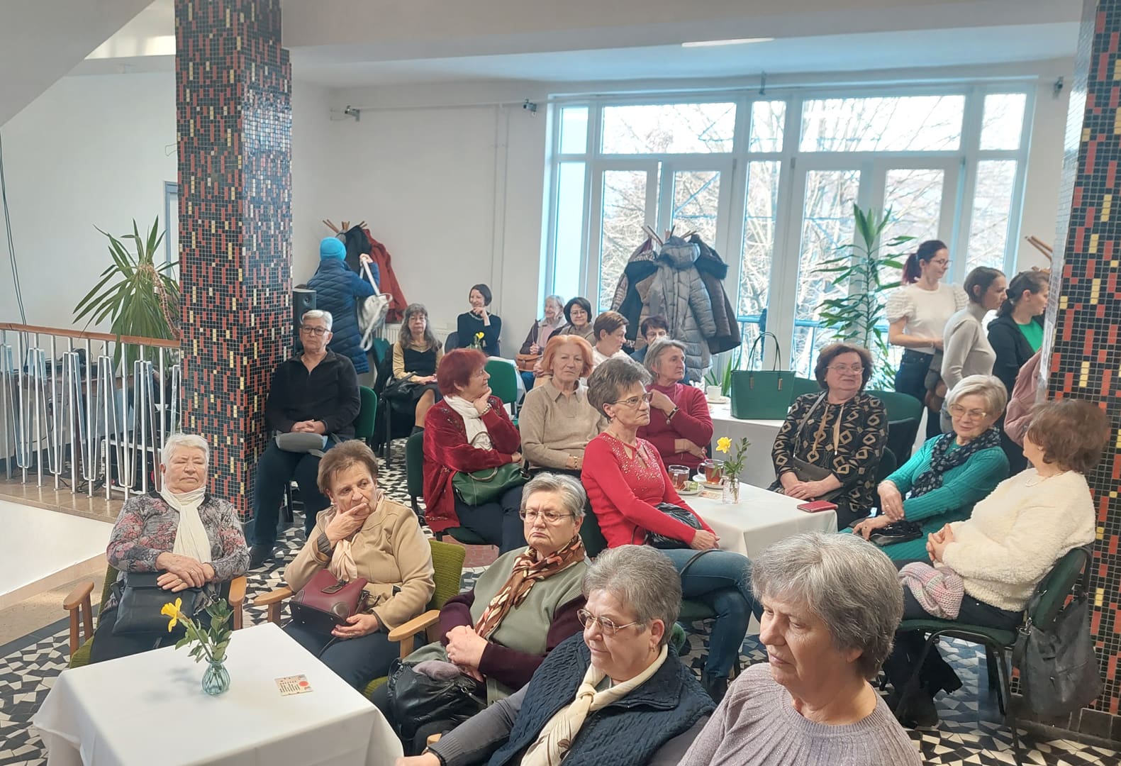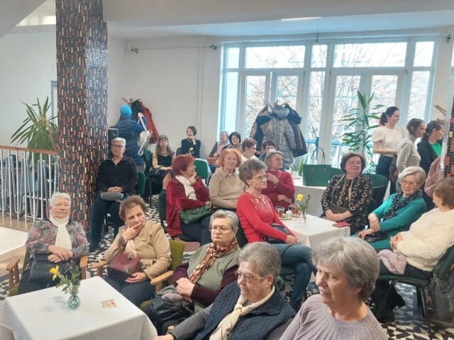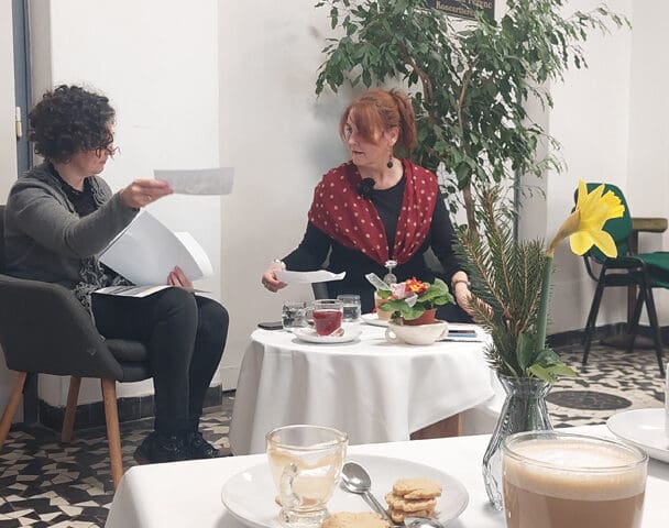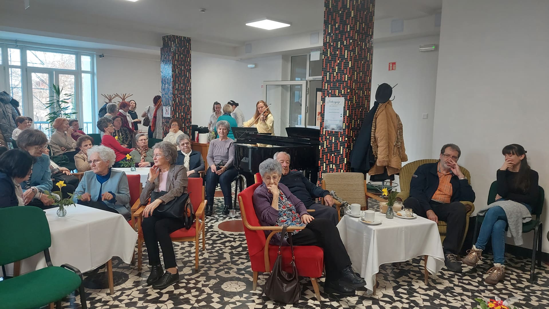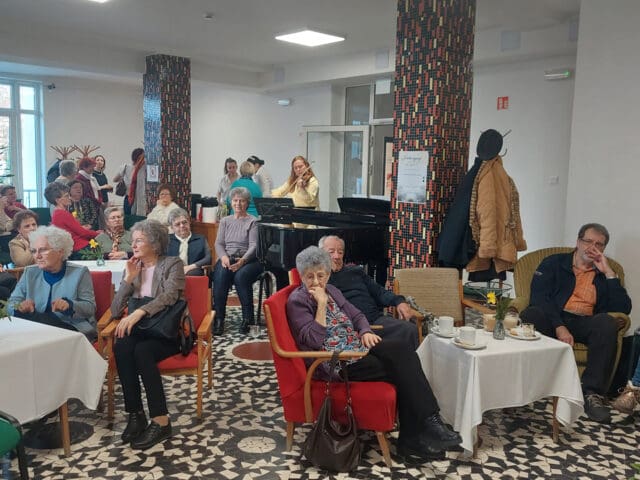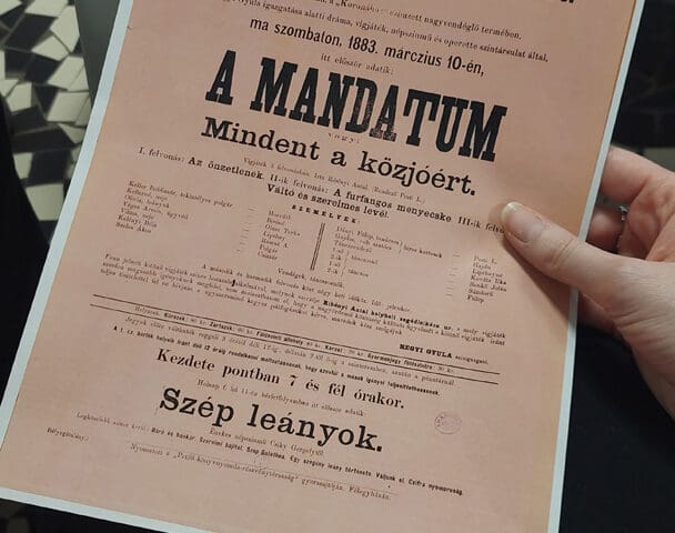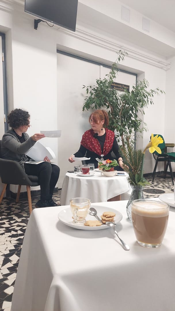 A Balázs Kávéház vendége dr. Kőfalviné dr. Ónodi Márta főlevéltáros volt, akivel Fekete Beatrix könyvtáros beszélgetett - elsősorban a színjátszásról. Ragyogó lehetőséget biztosított a ráhangolódásra Szeriné Biró Ágnes (hegedű) Kis-Fekete Vilmos (zongora) és Kurai-Kis Szilvia (gordonka) játéka, melyet hálásan fogadott a népes hallgatóság. Esett szó mozi(k)ról, vándorszínészek előadásairól, a műkedvelő iparos ifjak sok évtizedes sikereiről, de az iskolai színjátszásról is. A könnyed, csevegő időutazás közel másfél évszázadon suhant át, melyet korabeli színlapok, fényképek és egyéb dokumentumok tettek még érzékletesebbé.