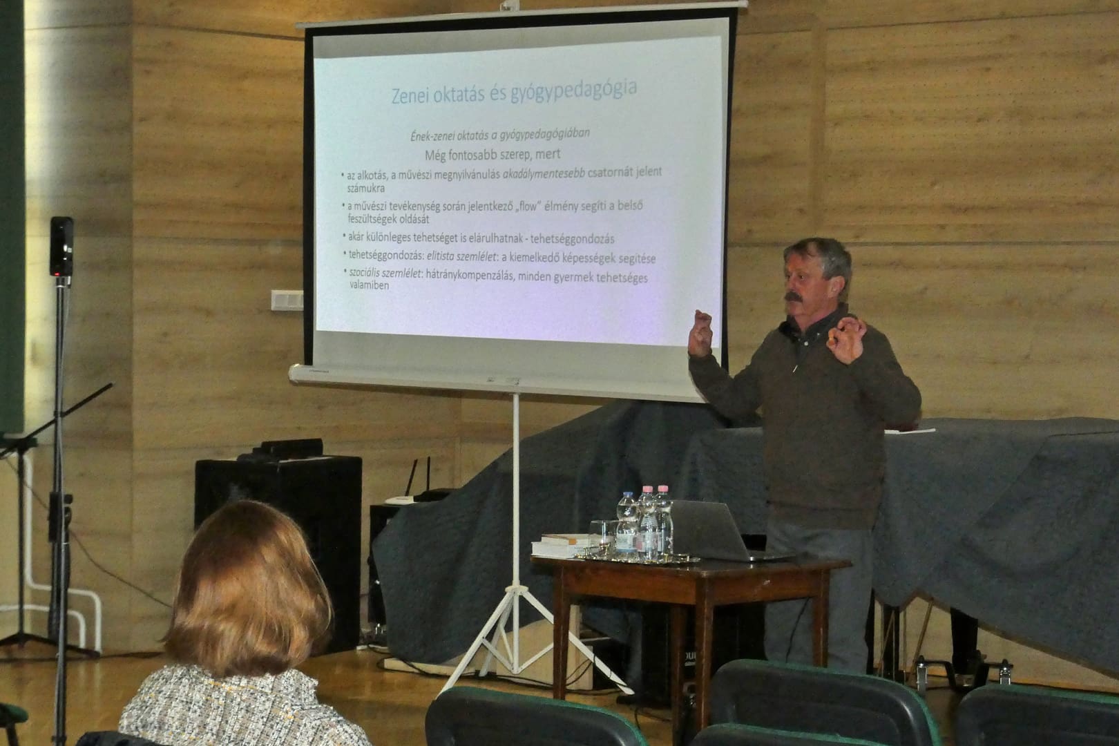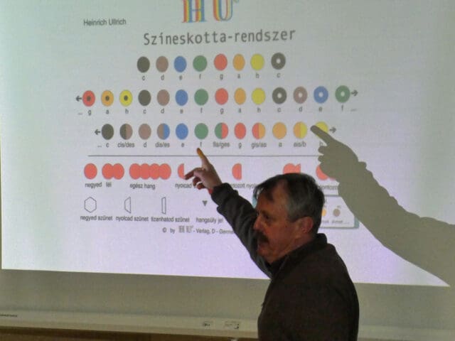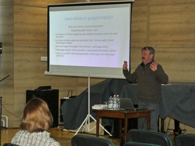 A művészeti iskola vendége Kaibinger Pál volt február 5-én, aki az ELTE Bárczi Gusztáv Gyógypedagógiai Kar oktatója és maga is zenetanár. Előadása első részében áttekintette és definiálta azokat a kihívásokat, melyek előfordulhatnak egy gyermek életében az autizmustól az ADHD-ig. Rávilágított, hogy a zenei oktatásnak a gyógypedagógiában még fontosabb szerep jut a gyermekek fejlesztésében érzelmi, értelmi és szocioterápiás téren is. Számos művész, tudós példájával mutatta be az előadó, hogy hátrányaik ellenére tehetségüket is kifejezésre juttathatják az érintett emberek.
