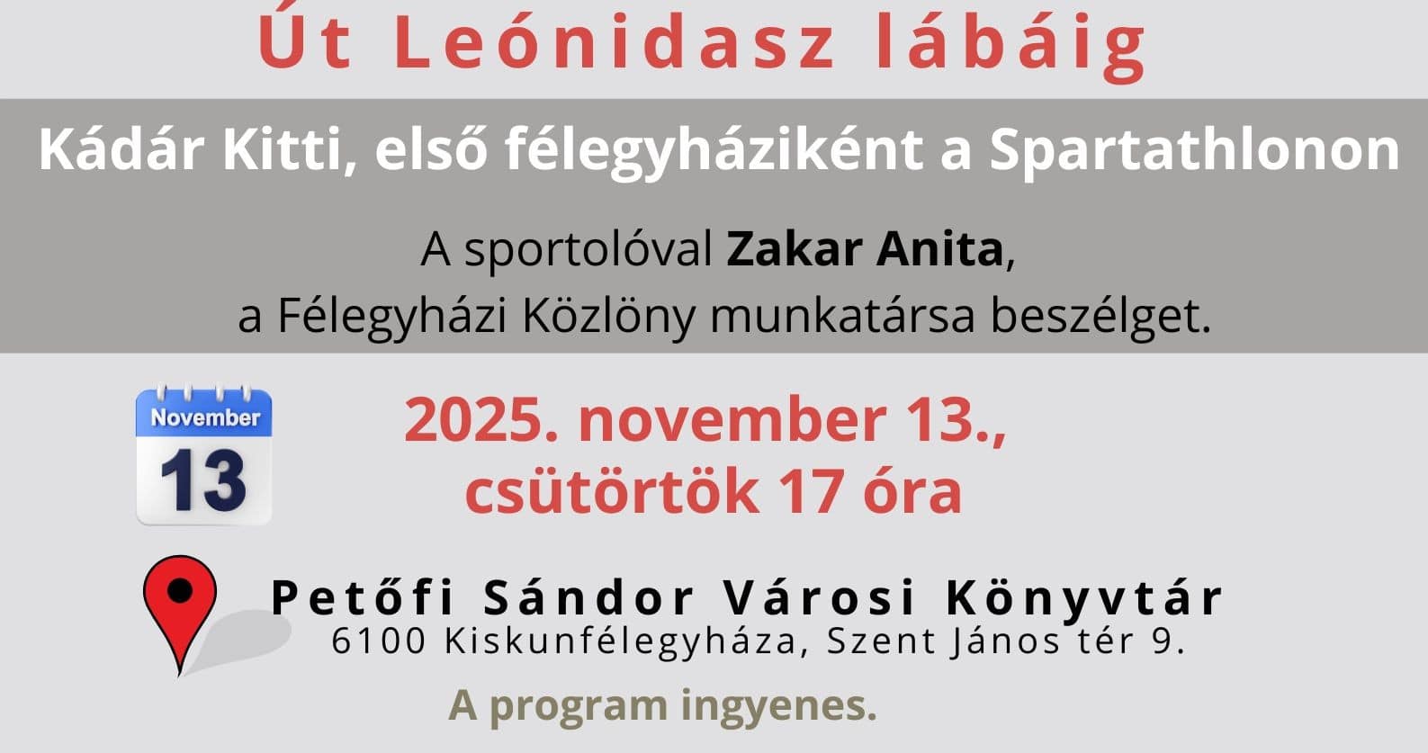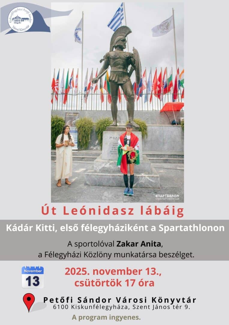 Kádár Kitti, az első félegyházi, aki teljesítette a legendás Spartathlont, mesél élményeiről és a versenyre vezető útról. November 13-án, csütörtökön 17 órakor a Városi Könyvtárban tartják a Út Leónidasz lábáig című beszélgetést, ahol a sportoló bepillantást enged a 246 kilométeres ultramaraton kihívásaiba és a felkészülés mindennapjaiba.