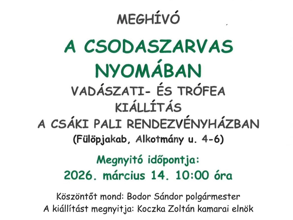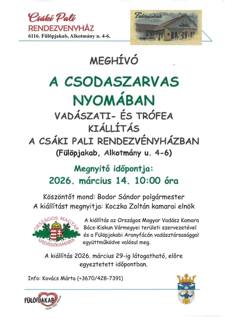 Különleges vadászati és trófea kiállítás nyílik március 14-én Fülöpjakabon, a Csáki Pali Rendezvényház épületében. „A csodaszarvas nyomában” című tárlat a magyar vadászkultúra hagyományait, értékeit és látványos trófeáit mutatja be az érdeklődőknek.