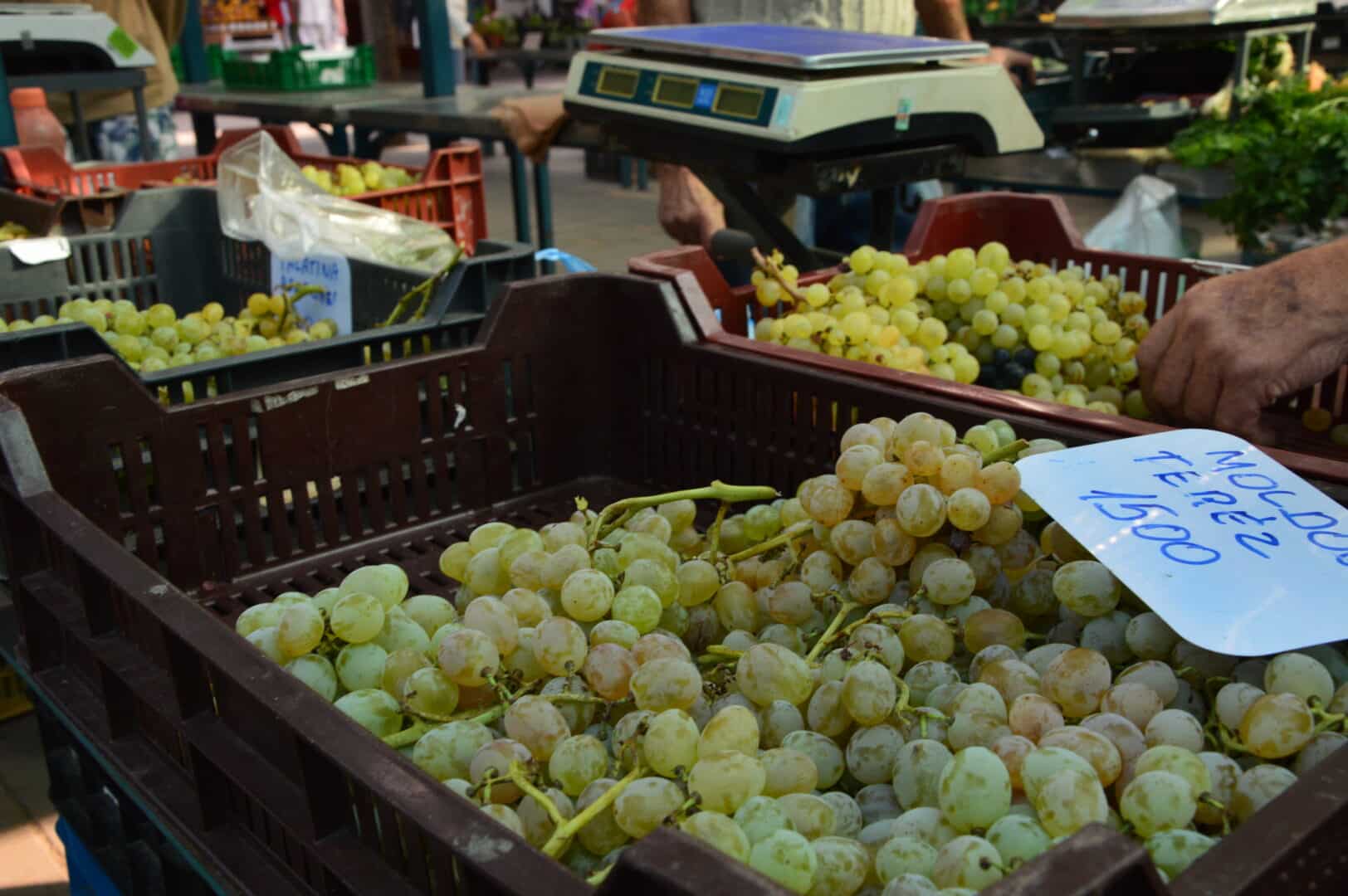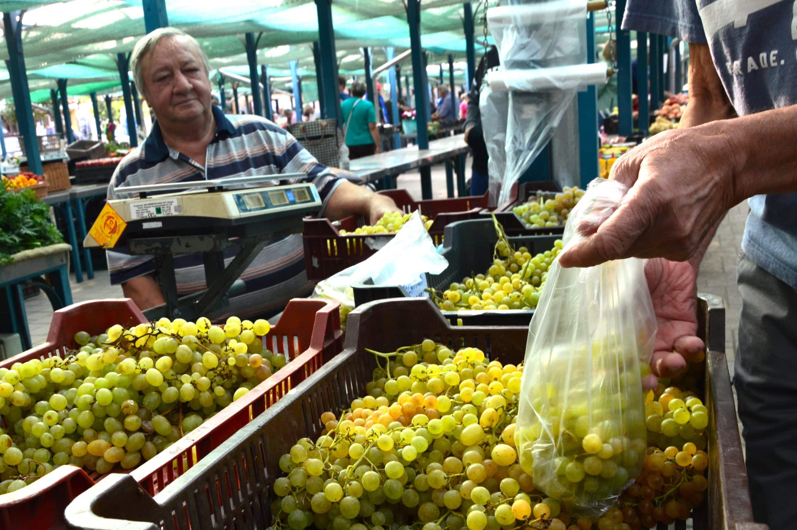Seres István standján számos szőlőfajta közül választhatnak a piacra látogatók. A gazda elmondta, hogy 400 négyszögöl nagyságú szőlőskertjében 70 fajtával foglalkozik.