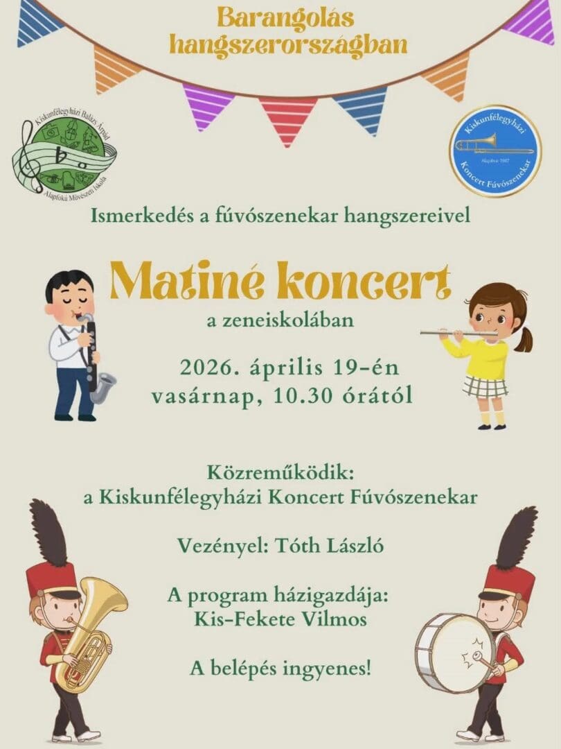 Szeretettel várnak minden érdeklődőt egy különleges hangulatú, ingyenes matiné koncertre a zeneiskolába, ahol a zene nemcsak megszólal, hanem életre is kel. A délelőtti program célja, hogy közelebb hozza a gyerekekhez és családokhoz a fúvószenekar hangszereit, miközben sok zenével és felszabadult, vidám hangulattal ajándékozza meg a közönséget.