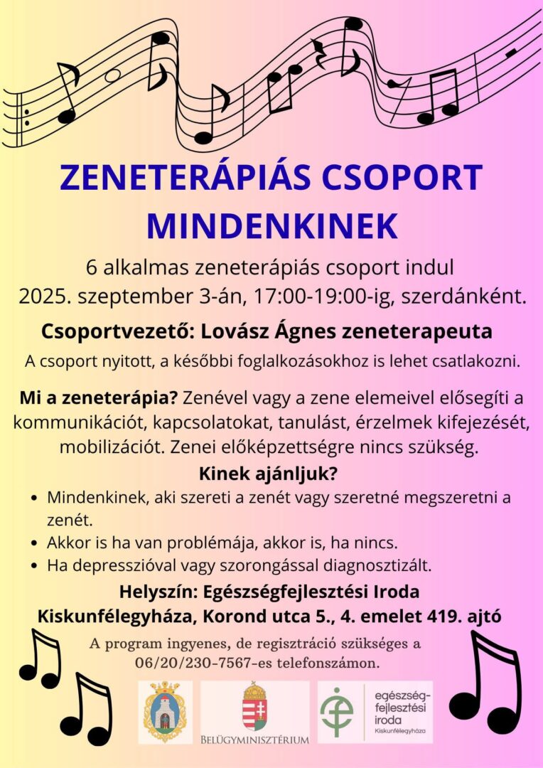 A zeneterápiás csoport szeptember 3-án indul, minden szerdán 17 és 19 óra között várja a résztvevőket a Kiskunfélegyházi Egészségfejlesztési Irodában (Korond utca 5., 4. emelet 419. ajtó). A program ingyenes, de regisztráció szükséges a 06/20/230-7567-es telefonszámon.