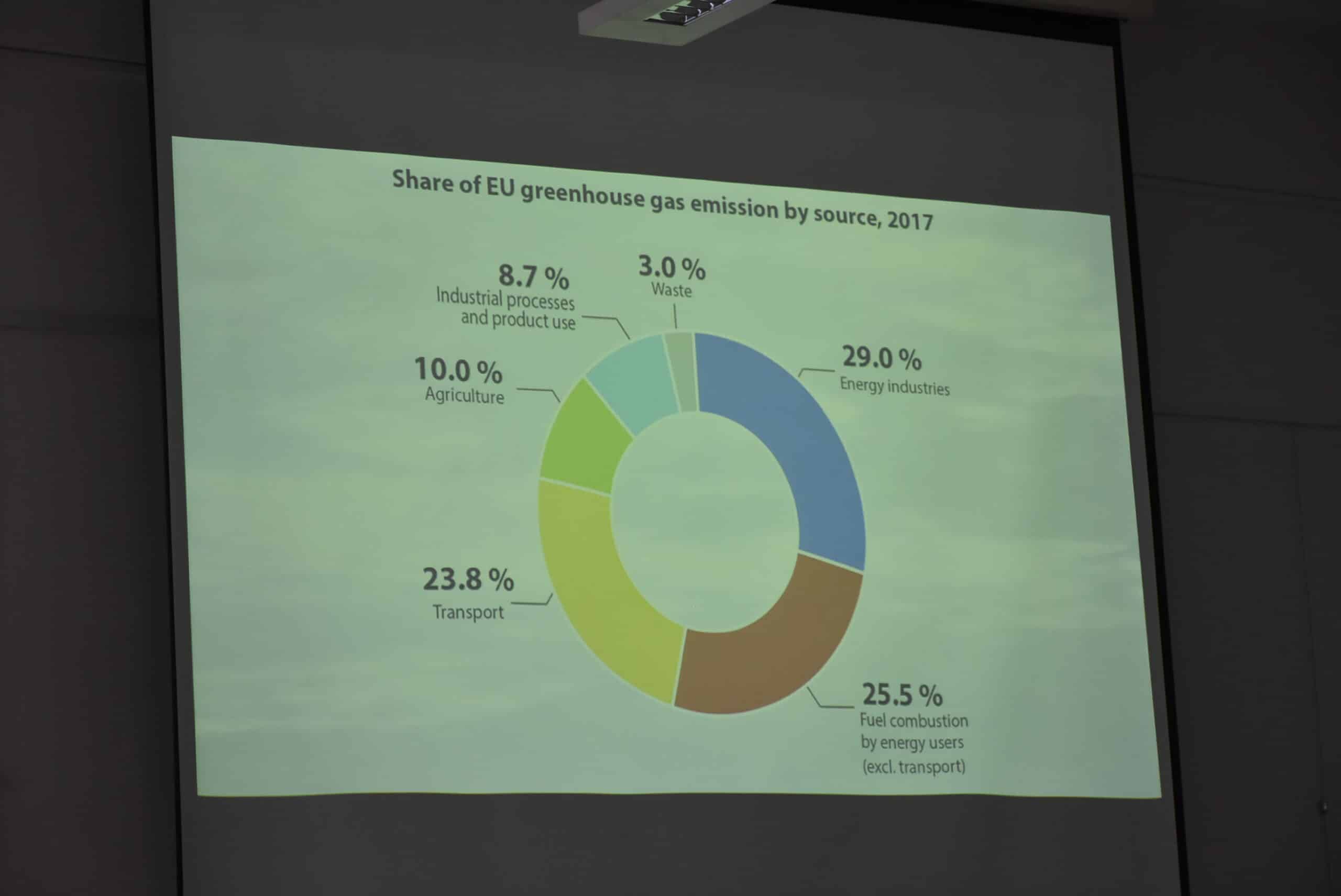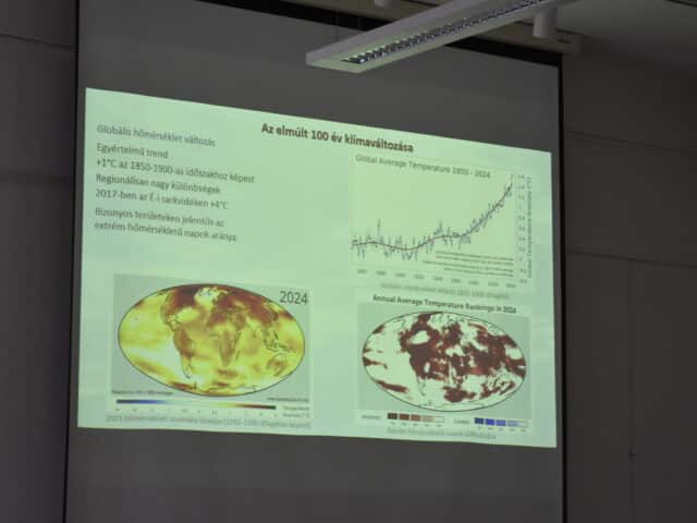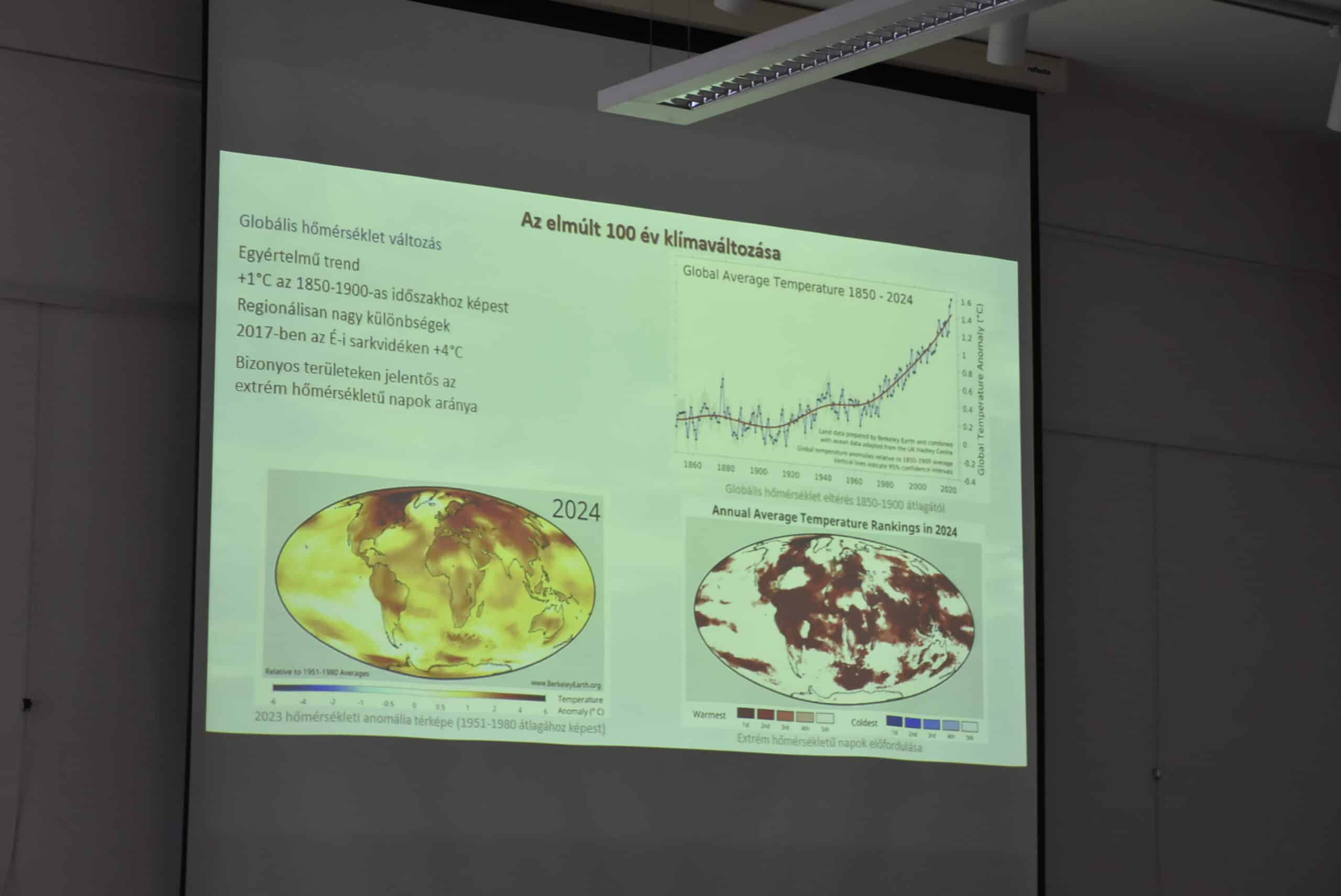 Dr. Gál Tamás kiemelte: az elmúlt száz év során a földi átlaghőmérséklet körülbelül egy Celsius-fokkal nőtt, a felmelegedés pedig tovább folytatódik. A folyamat fő mozgatórugója az emberi tevékenység, különösen a közlekedés, az ipar, az energia- és üzemanyag-felhasználás, valamint a mezőgazdaság. A kibocsátási adatok alapján a legnagyobb terhelést az energiatermelés (29%), az üzemanyag-használat (25,5%) és a közlekedés (23,8%) okozza, de az ipari folyamatok (8,7%) és a hulladékgazdálkodás (3%) szerepe sem elhanyagolható.